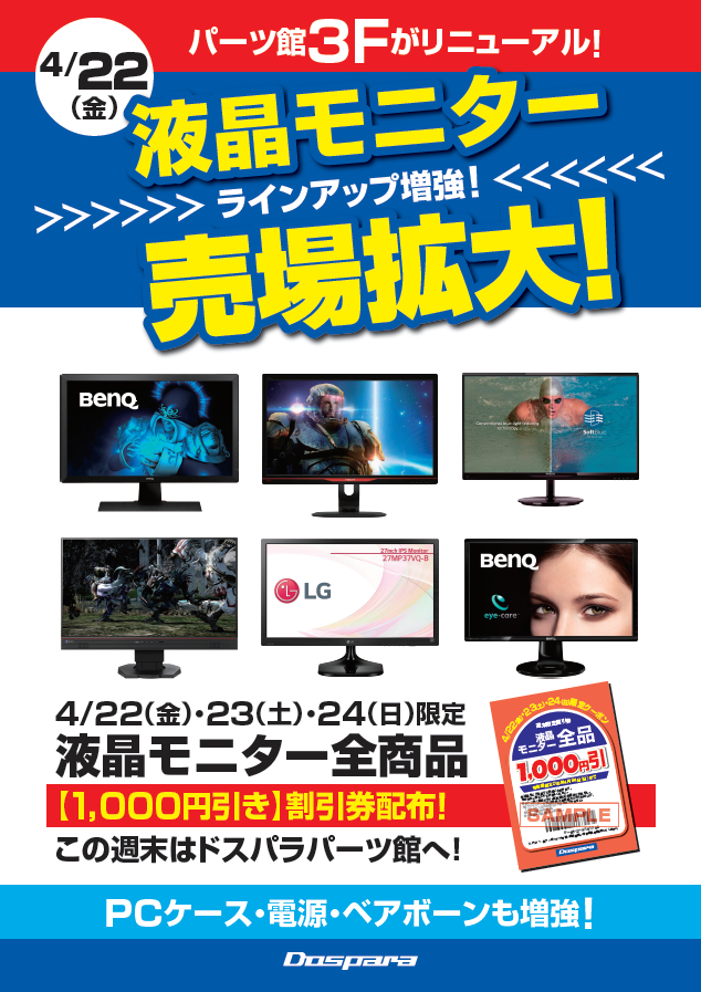 2016年04月22日 【ドスパラパーツ館】4/22(金) ドスパラパーツ館3Fがリニューアル! 【ドスパラパーツ館】4/22(金) ドスパラパーツ館3Fがリニューアル! 本日4/22(金)、ドスパラパーツ館3Fがリニューアルしました! 液晶モニタの売場を拡大!ラインアップ増強です! 合わせて PCケース・電源・ベアボーンも3Fへ移動しボリュームアップ! リニューアル記念として 今週末は 4/22(金)・23(土)・24(日)限定 液晶モニター全商品【1,000円引】値引券を店頭で配布いたします!ドスパラパーツ館〒101-0021東京都千代田区外神田3-10-8 中澤ビル電話番号 03-6866-7224 営業時間 11:15~20:00E-Mail pkn@dospara.co.jp 「秋葉原別館」カテゴリの最新記事 < 前の記事次の記事 >