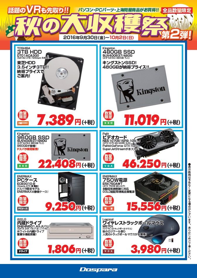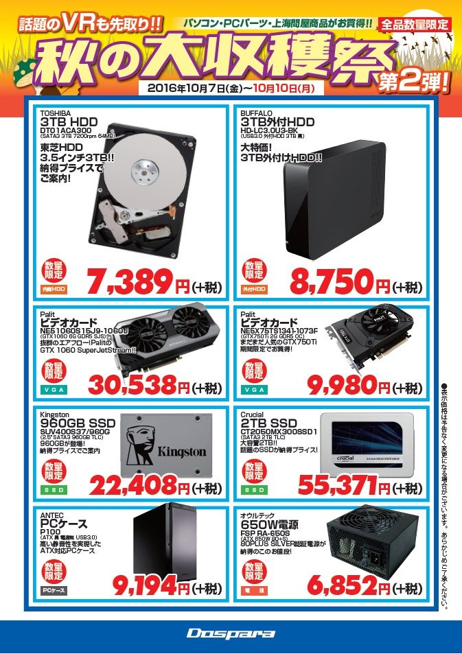 2016年10月07日 今週の週末特価品 今週の週末特価品 今週末 10/7(金)~10/10(月)は 3TBハードディスクが激安! さらに Crucial製 2TB SSDが超特価! そしてPalit製GTX 1060も大変お買得です! 上海問屋からは大人気 ゲーミングデバイスがお買い得!ゲーミングマウス、マウスパッド、ゲーミングヘッドホンなど貴方のゲーム環境を良くしませんか?つづきをクリック↓ 上海問屋は週末特価品を多数ご用意しました!店舗スタッフ一同、ご来店お待ちしております! 「今週の週末特価」カテゴリの最新記事 < 前の記事次の記事 >