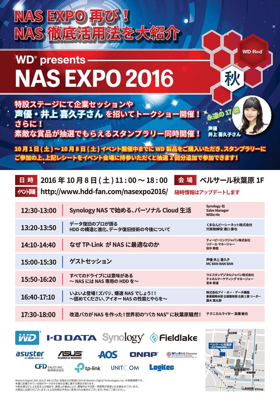 2016年09月30日 【パーツ館】NAS EXPO2016 スタンプラリーも同時開催!! 最大4回まで抽選ができます!!・すべての対象店舗のスタンプを集めていただくと1回抽選ができます。・さらにイベント風景をSNSにアップいただいた方はもう1回抽選ができます。・10月1日(土)からイベント当日の10月8日(土)の期間内にドスパラパーツ館でWD製 内蔵HDD,あるいは外付けHDDのいずれかをご購入頂いた方はレシート持参で2回抽選が できます。※中古製品は除きます 「イベント」カテゴリの最新記事 < 前の記事次の記事 >