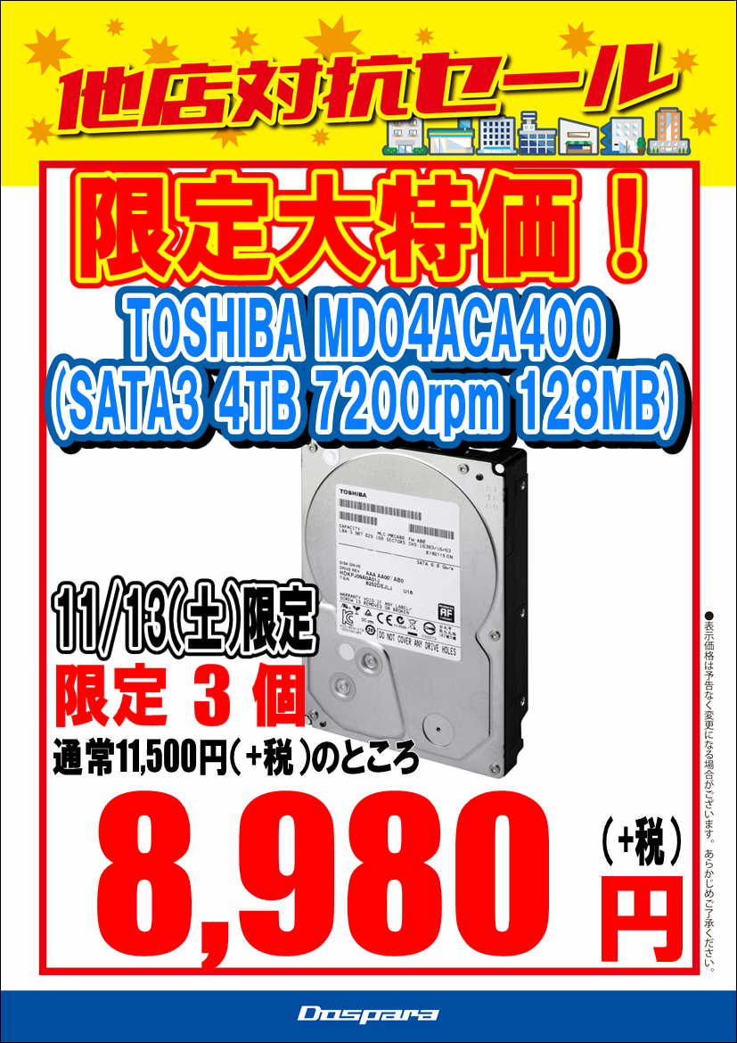 TOSHIBA MD04ACA400 (SATA3 4TB 7200rpm 128MB) 8,980-(+税)