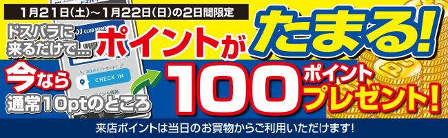 2017年01月18日 【半期決算売尽し】週末は来店ポイント10倍! 1月21日~1月22日 1月21日~1月22日の2日間限定!今週末ドスパラへご来店してチェックインすると来店ポイント10倍!通常の10ポイントのところ 100ポイントへ増量加算されたポイントは当日お買物からご利用いただけます!是非、当日のお買いものにご利用ください。※増額期間は、1月21日 9:00から1月22日22:00までの期間となります。加算ポイントの有効期限は 2月1日までとなります。 「セール」カテゴリの最新記事 < 前の記事次の記事 >