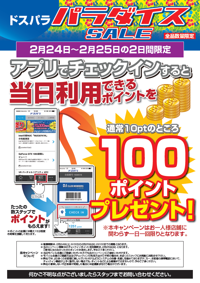 通常の10ポイントのところ 100ポイントへ増量来店ポイント増額は 2018/2/17(土) ~ 2018/2/18(日)22:00 となります。増額分のポイントに関しては、2018年2月18日(日)までの期間限定となりますので