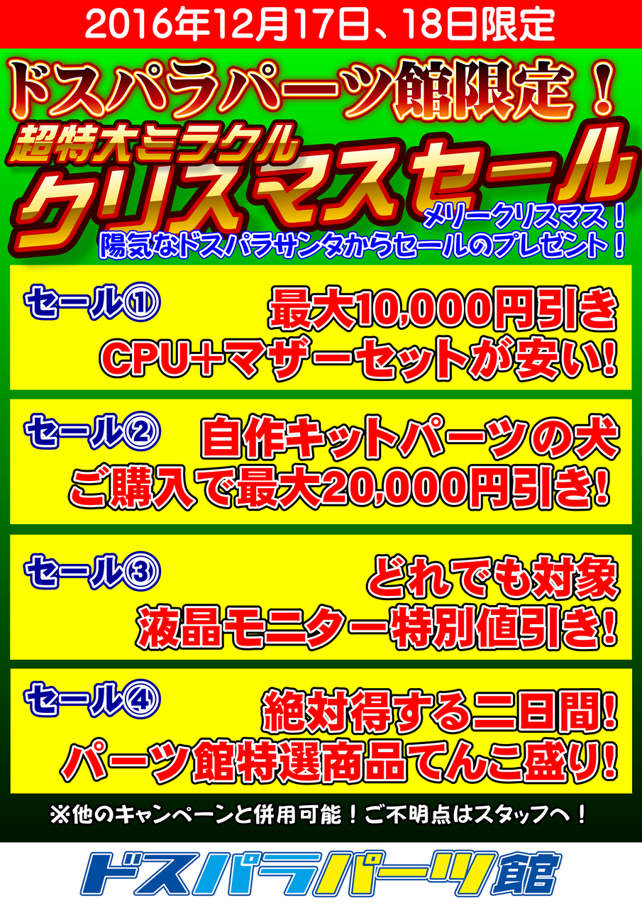 2016年12月16日 【パーツ館限定】12/17~18限定 超特大ミラクルクリスマスセール!!! パーツ館限定のお得な2日間!!ドスパラパーツ館限定【超特大ミラクル クリスマスセール】~~~~~~~~~~~~~~~~~~~~~~~~~~~~~~【セール①】最大10,000円引き!CPU+マザーセットが安い!~~~~~~~~~~~~~~~~~~~~~~~~~~~~~~【セール②】自作キット「パーツの犬」モデル今ならご購入で最大20,000円引き!~~~~~~~~~~~~~~~~~~~~~~~~~~~~~~【セール③】全品対象でお買い得!液晶モニター全品特別値引き!~~~~~~~~~~~~~~~~~~~~~~~~~~~~~~【セール④】絶対得する二日間!特選商品てんこ盛りでお届けします!画像では一例をご紹介!その他たくさんの対象商品は【→こちら】
