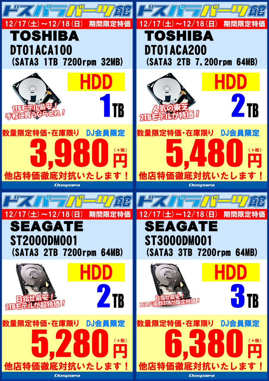 2016年12月10日 【パーツ館限定】緊急追加!人気の3TBハードディスクが超超超特価!! 12/10~11 パーツ館限定「特大ボーナスセール」好評開催中!!お得な商品てんこ盛りなこのセールですが、さらにお得な商品を緊急追加!Seagate 3.5インチHDD 3TBモデル「ST3000DM001」です!驚きの価格はなんと5,980円+税!!在庫限りの数量限定なので、お見逃しなく!!