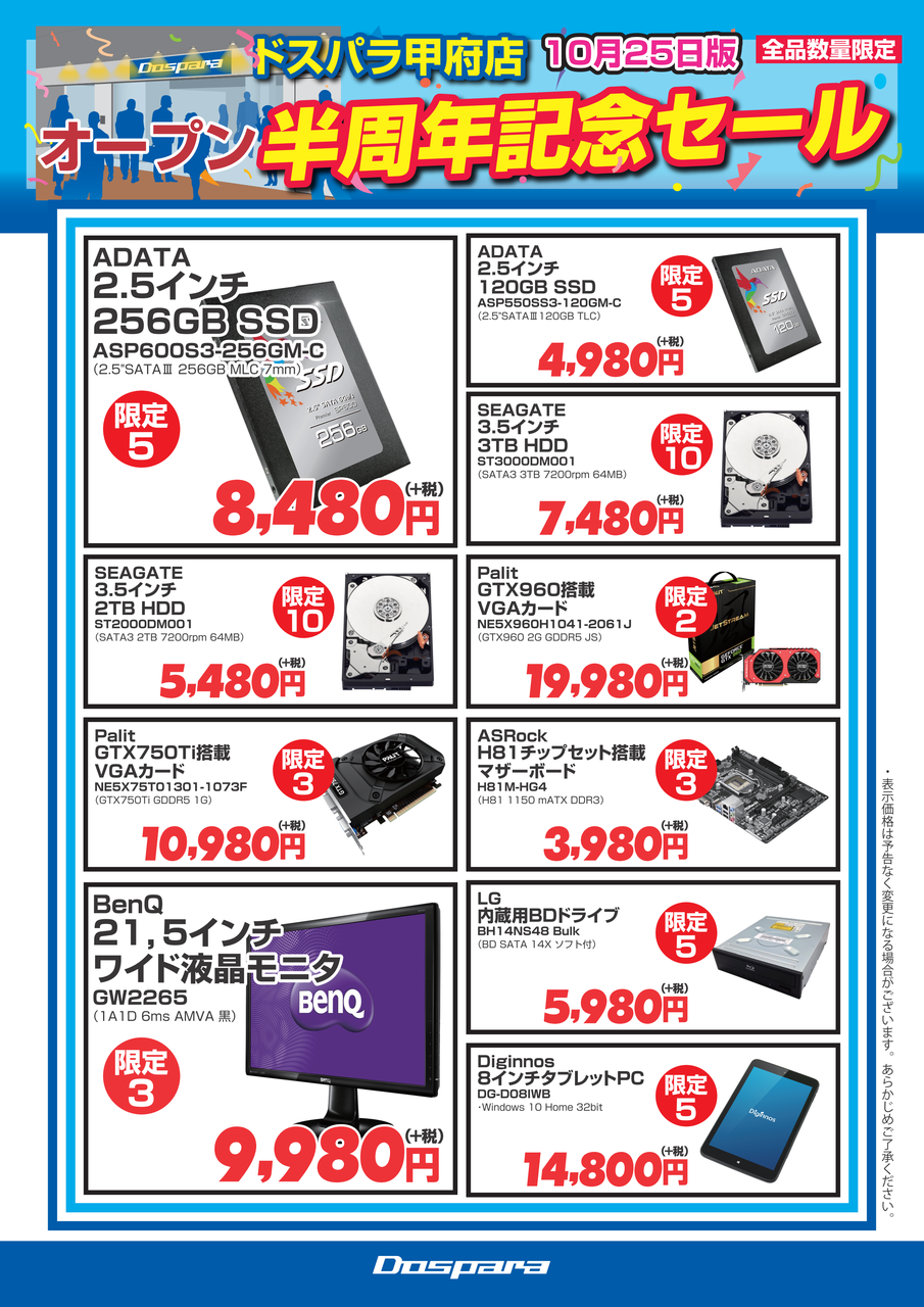 【ドスパラ甲府店】10/24(土)~25(日)半周年記念セール開催します